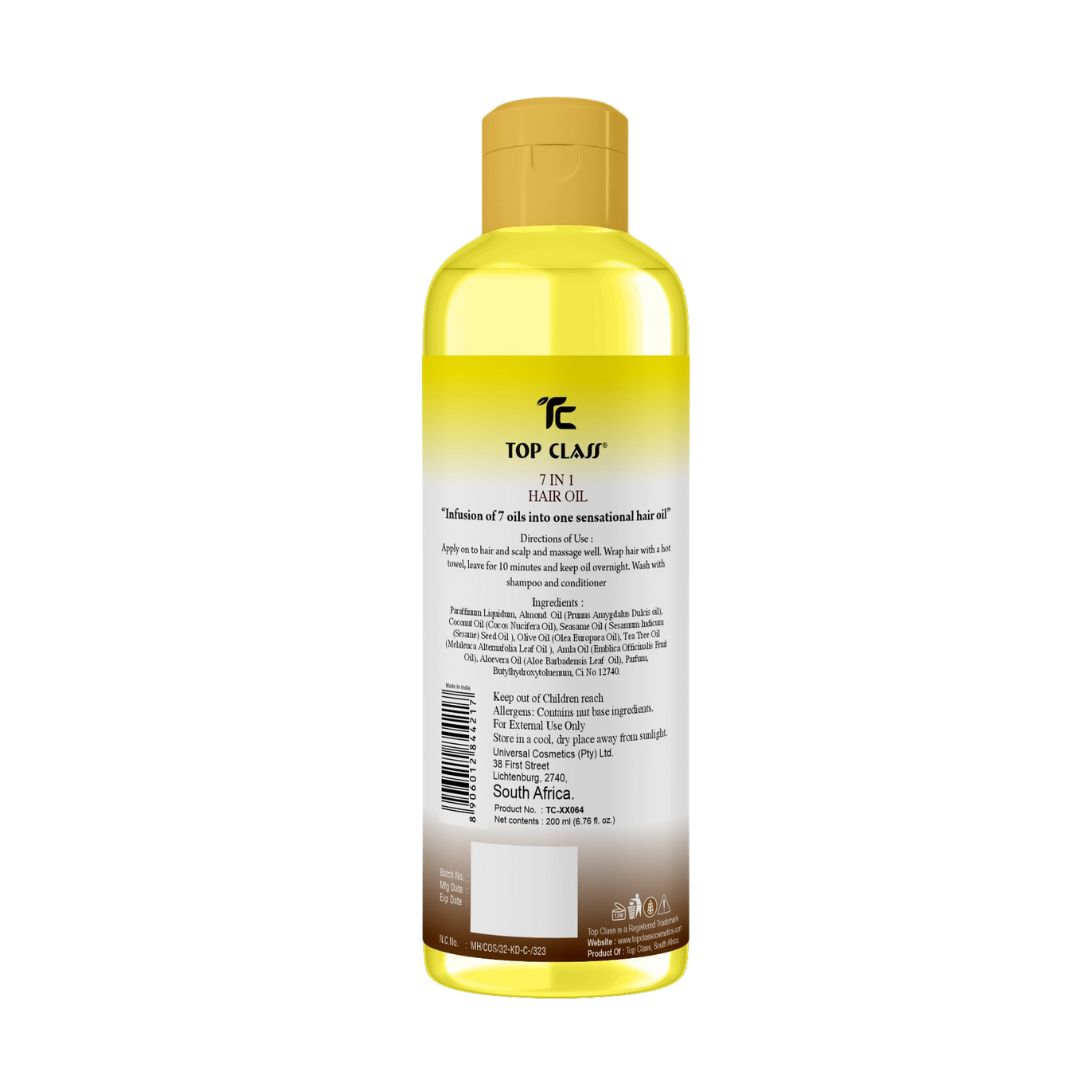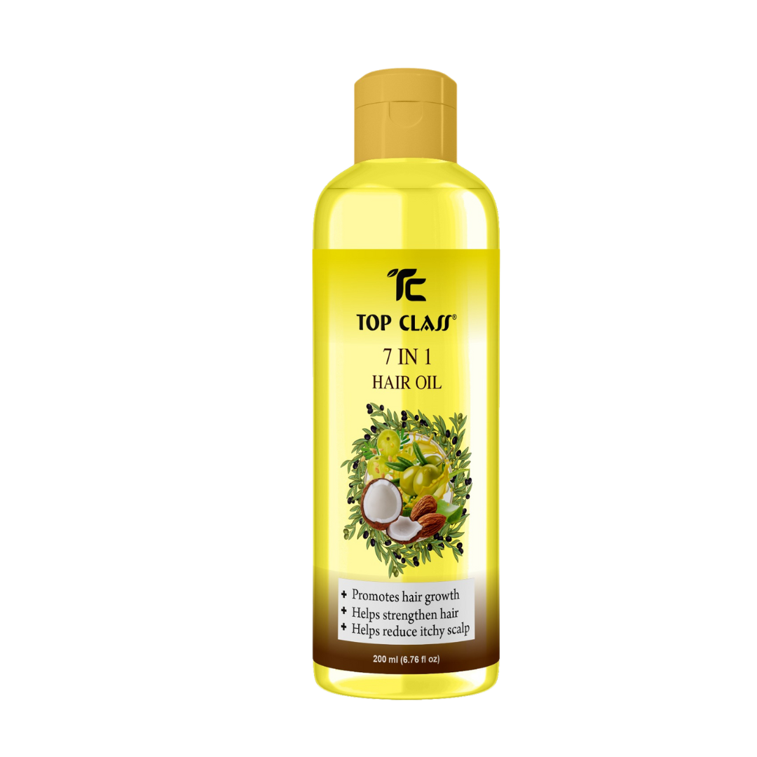 Experience the power of 7 natural oils in one bottle with our Top Class 7 in 1 Hair Oil. A blend of almond, coconut, olive, tea tree, amla, and Aloevera oil provides nourishment and strength to your hair, leaving it smooth and shiny. Try it now and see the difference!