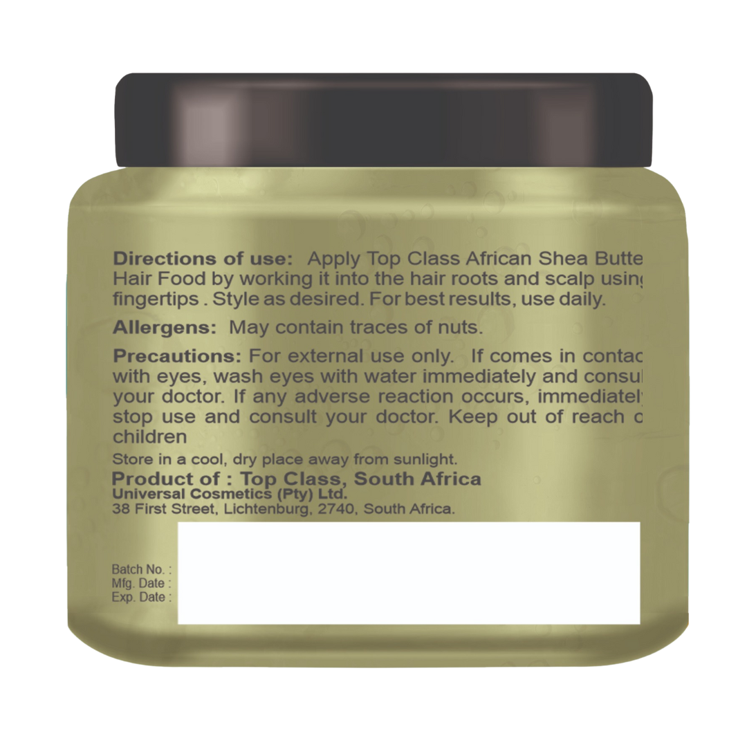 Top Class Africa Shea Butter Hair Food is a creamy, ultra-hydrating hair food formula, designed to nourish and strengthen hair strands. It contains pure shea butter to provide deep and long-lasting moisturization while softening and revitalizing dull, brittle hair. Its unique formula helps to improve hair texture, locking in moisture and promoting healthy hair growth.