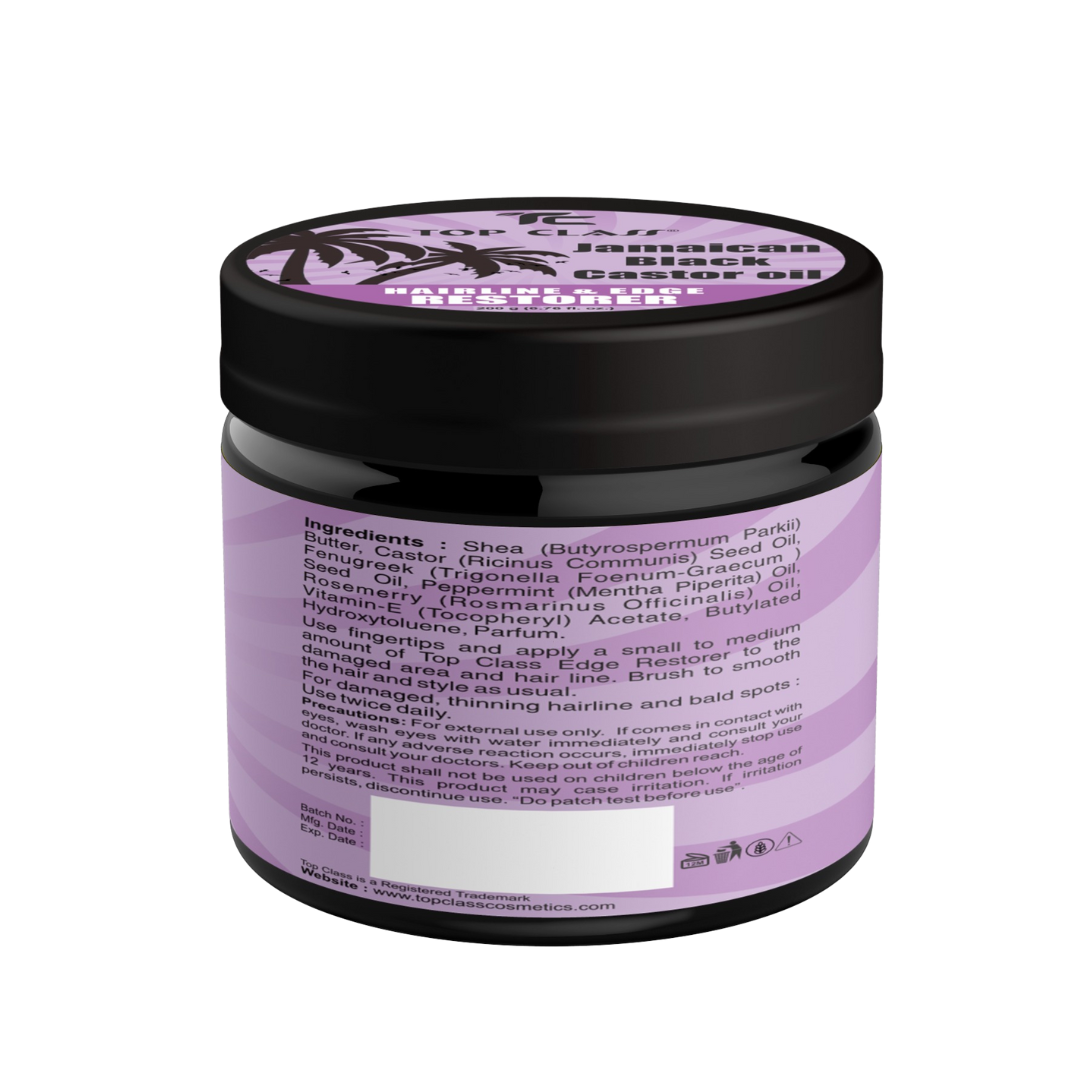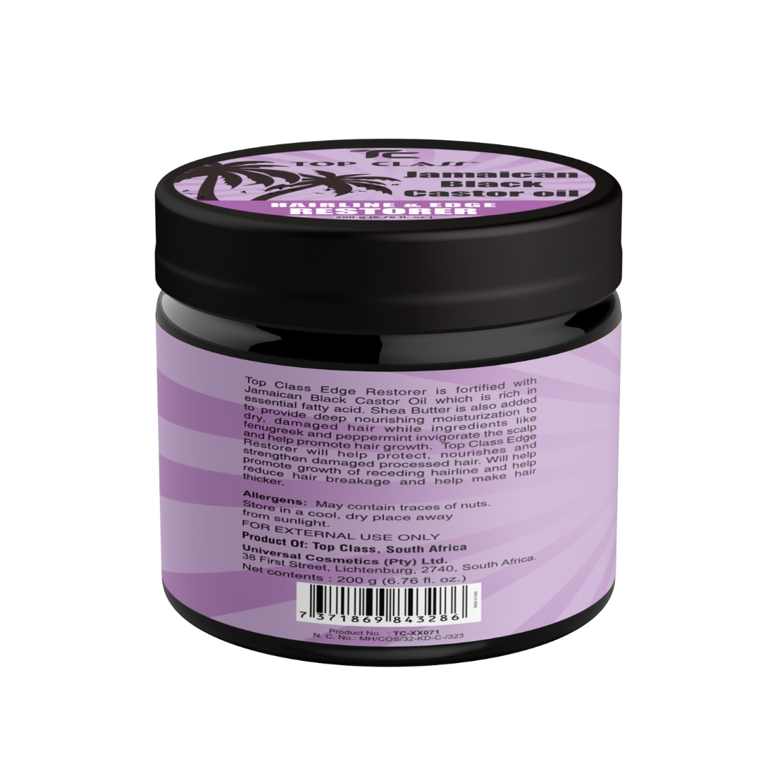 Top Class Edge Restorer is fortified with Jamaican Black Castor Oil which is rich in essential fatty acid. Shea butter is also added to provide deep nourishing moisturization to dry, damaged hair while ingredients like fenugreek and peppermint invigorate the scalp and help promote hair growth. Top Class Edge Restorer will help protect, nourishes and strengthen damaged processed hair. Will help promote growth of receding hairline and help reduce hair breakage and make hair thicker.